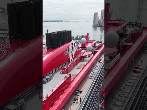 Epic Drone shot Exhaust Stacks on Brilliant Lady Virgin Voyages Cruise docked Port Miami Oct 16 2025