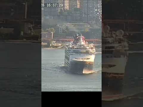 Helicopter overtakes departing cruise ship in Vancouver